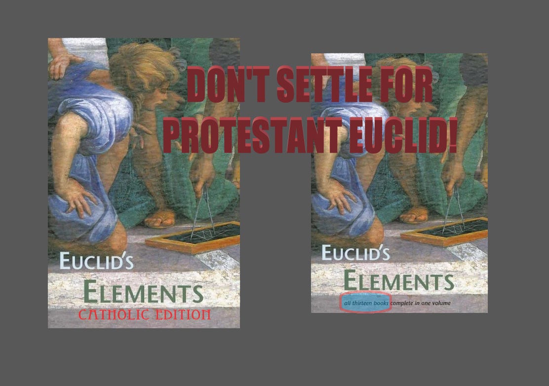 You probably studied geometry with a Protestant copy of Euclid’s Elements rather than the longer, complete, unedited Catholic translations.