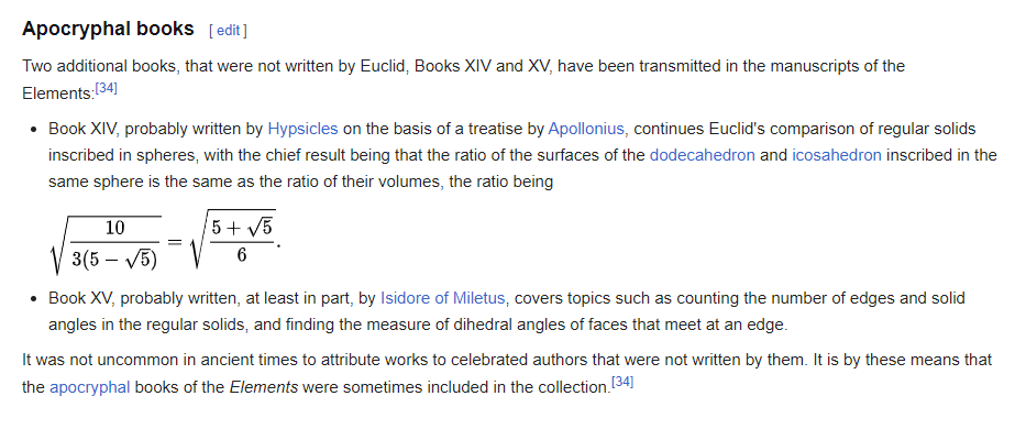 You see, Luther thought that measuring the dihedral angles of faces of polyhedral solids that meet at an edge was too much like measuring sanctifying grace or time spent in Purgatory, so he called Books XIV and XV, which included topics like this, apocryphal. Catholic copies of the Elements still have all 15 books.